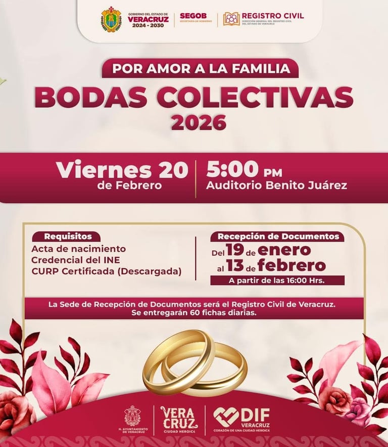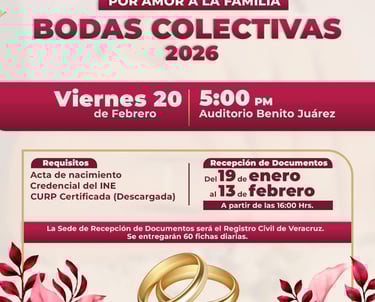Del 19 de enero al 13 de febrero, el H. Ayuntamiento de Veracruz, a través del DIF Municipal, abre la inscripción para participar en las Bodas Colectivas 2026 “Por amor a la familia”, un evento gratuito que permite a cada pareja formalizar legalmente su unión, garantizar sus derechos y obligaciones legales y celebrar su compromiso familiar ante la sociedad.