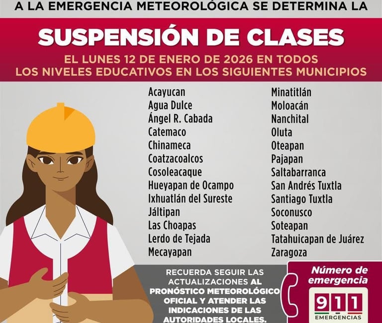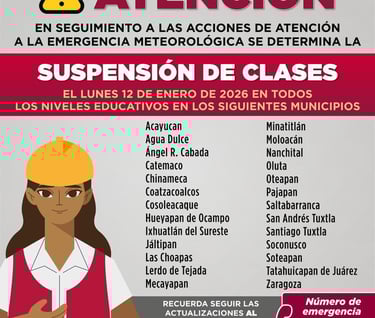 Ante el pronóstico de lluvias significativas para el sur del estado el día lunes 12 de enero, el Comité Estatal de Emergencias ha determinado la suspensión de clases en los siguientes municipios: