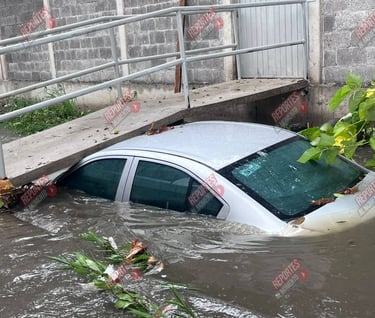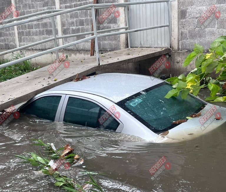 El incidente ocurrió sobre la calle Úrsulo Galván, a la altura de la cancha deportiva, cuando el conductor de un automóvil color gris intentó dar vuelta al percatarse de que la vialidad presentaba un alto nivel de agua debido a las lluvias recientes.