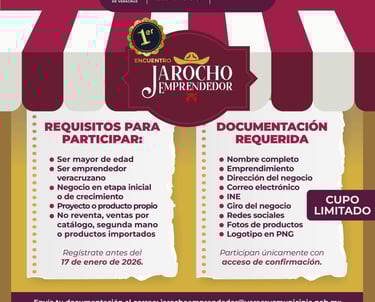 La Dirección de Desarrollo Económico y Portuario del H. Ayuntamiento de Veracruz invita a las y los emprendedores a formar parte del 1er Encuentro Jarocho Emprendedor, un espacio diseñado para