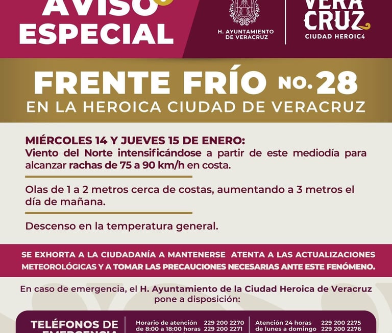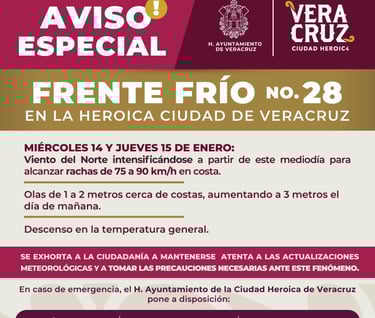 La Dirección de Protección Civil Municipal emite Aviso Especial para #VeracruzCiudadHeroica por la entrada del Frente Frío No. 28.